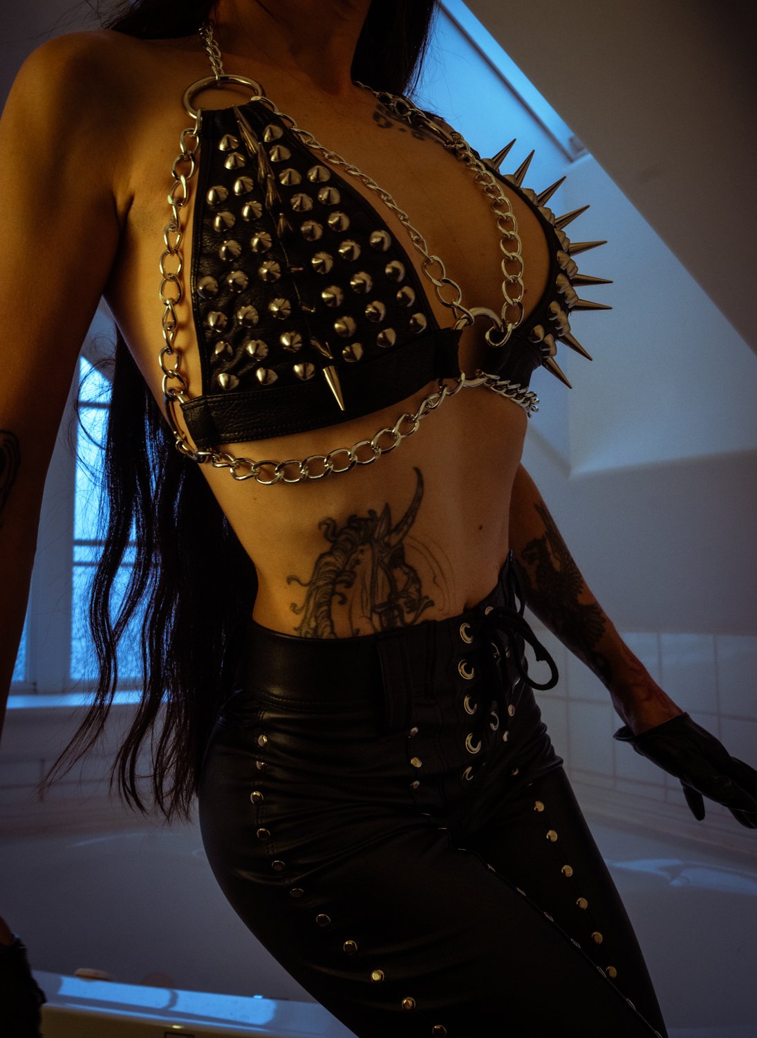 Made from scratch out of black faux leather with silver studs, chain, and metal detailing
