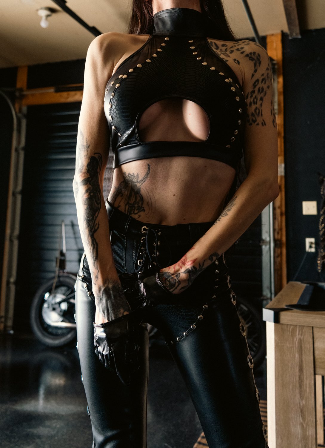Made from scratch out of leopard stretch velvet and black leather look spandex with metal detailing all around.