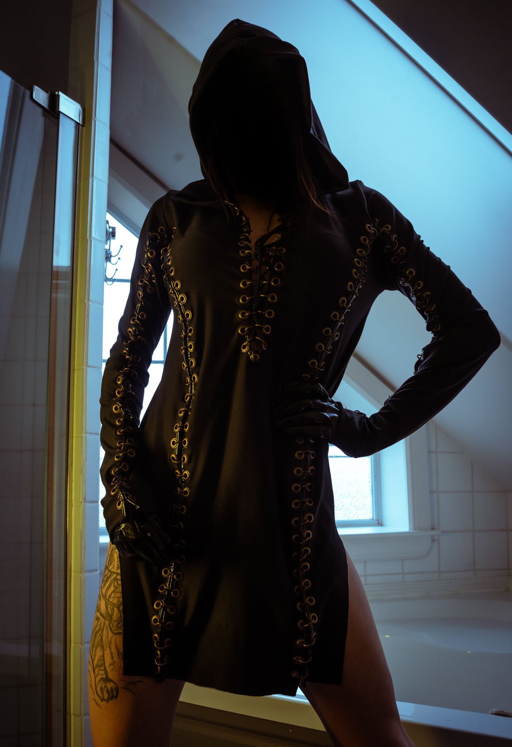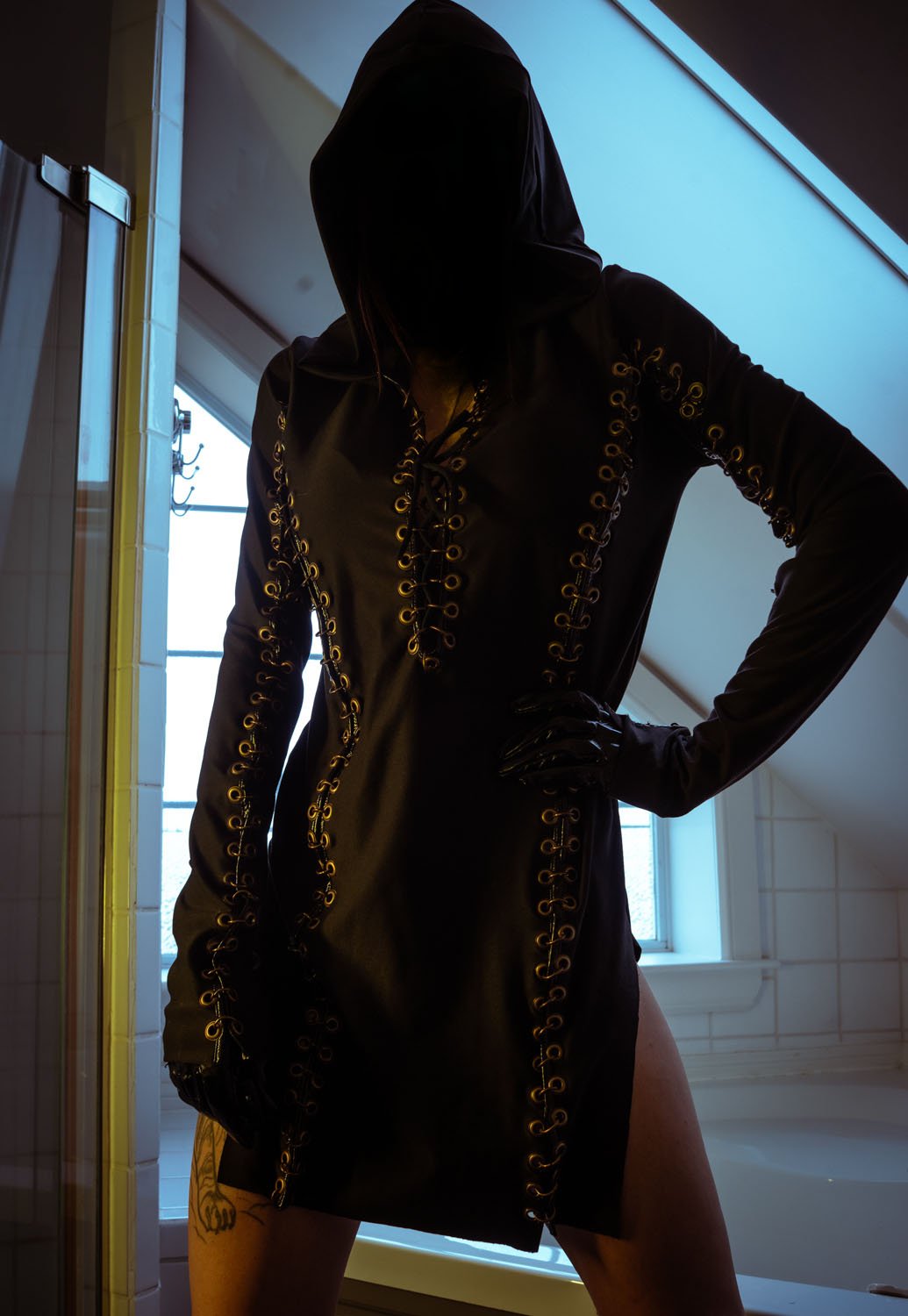 Made from scratch out of black jersey knit with brass grommets and o-rings and a lace up front!