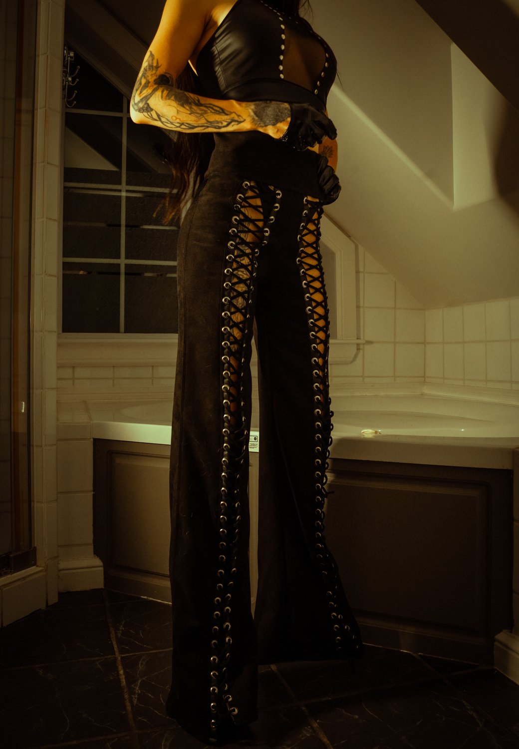 Made from scratch out of black faux suede with faux leather grommet casing and lace ups down the front!