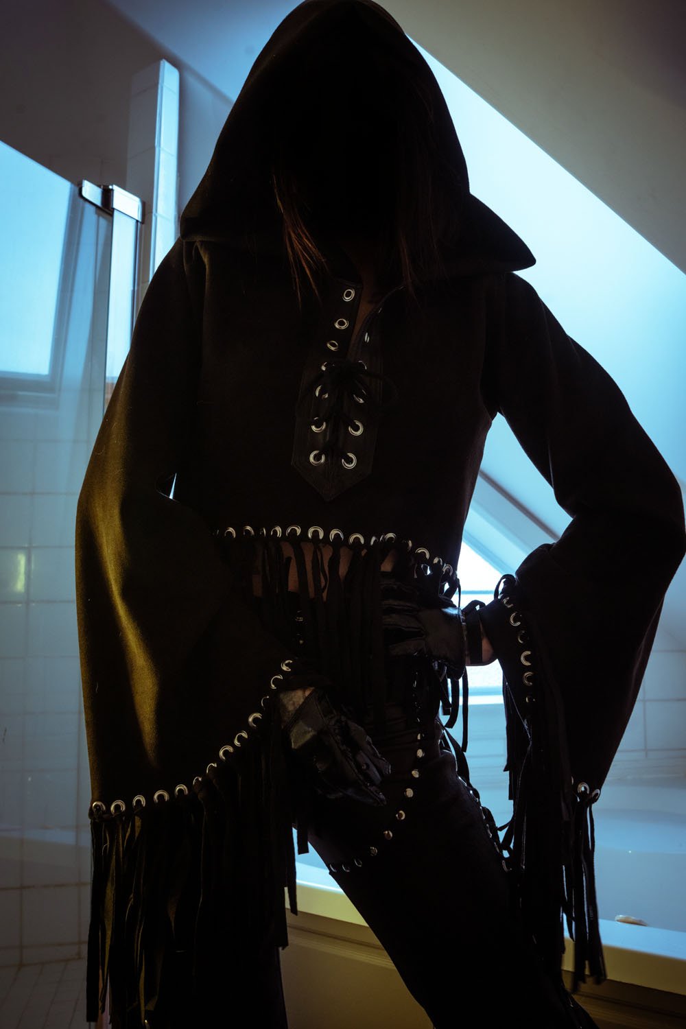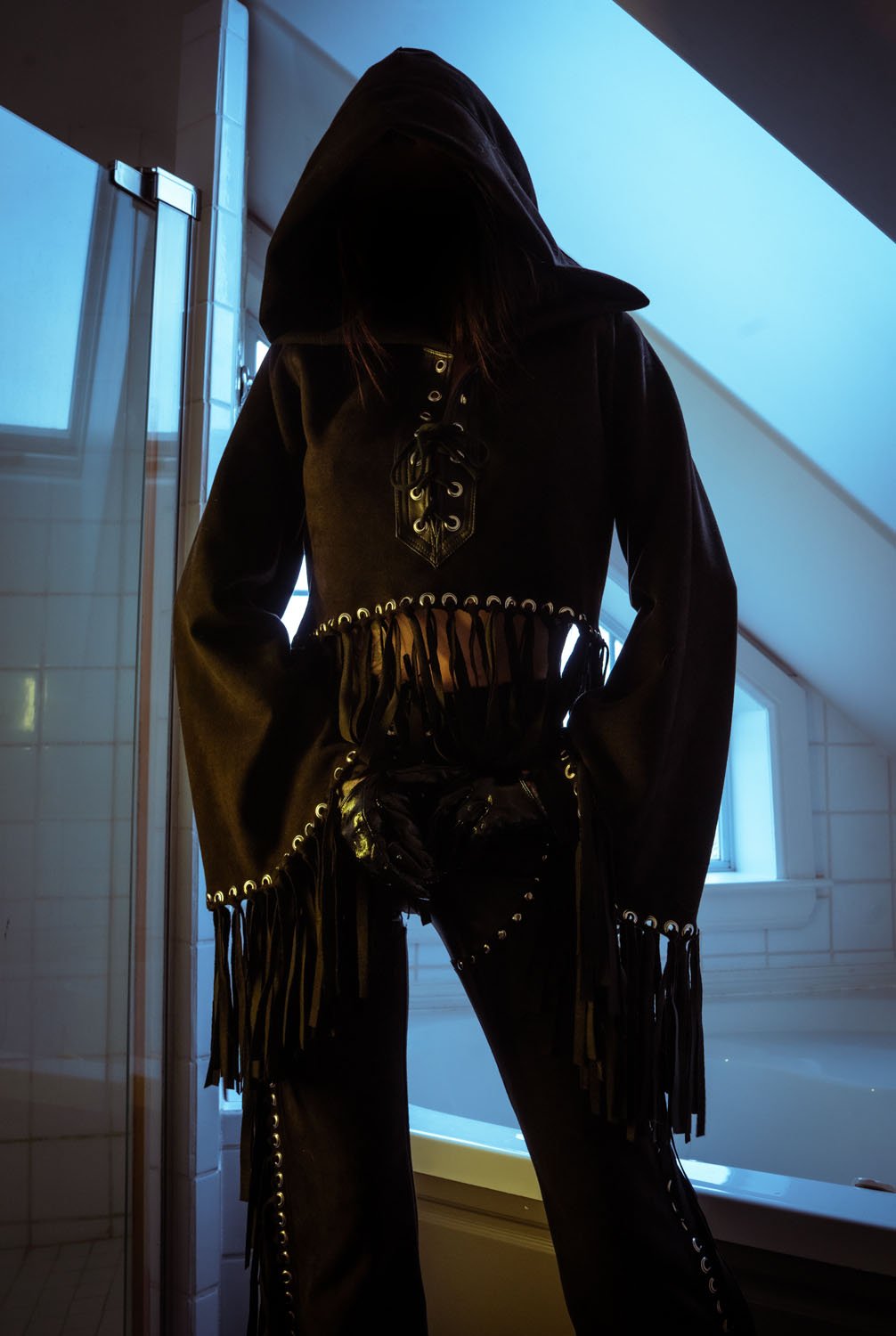Made from scratch out of stretchy black faux suede and black faux leather with silver grommets and faux suede fringe!