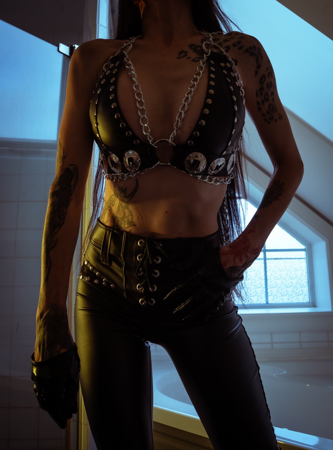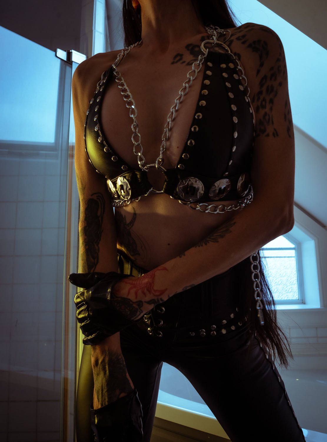 Made from scratch out of black genuine leather with silver conchos, chain, and metal detailing