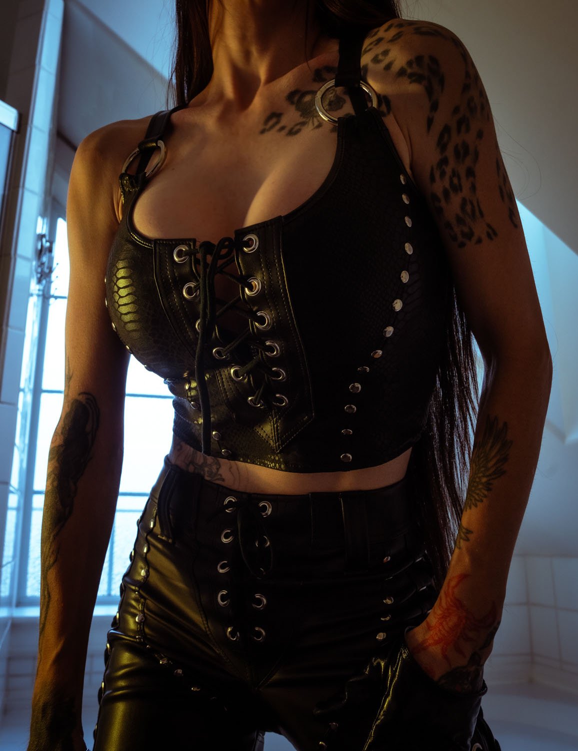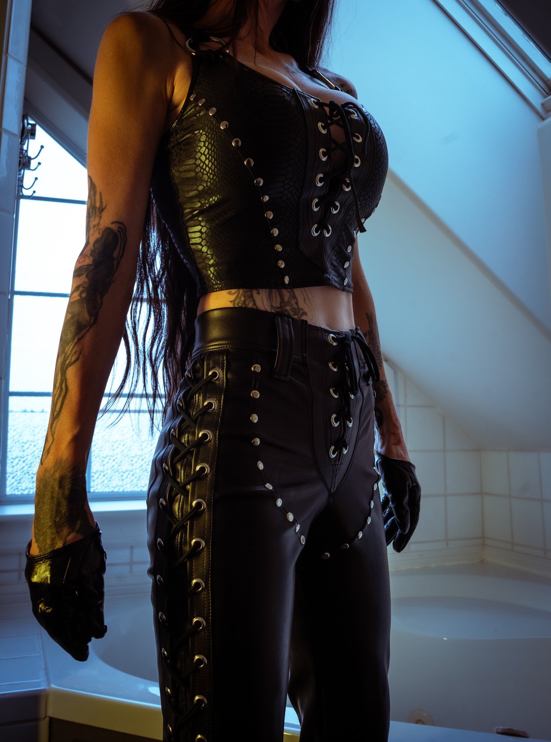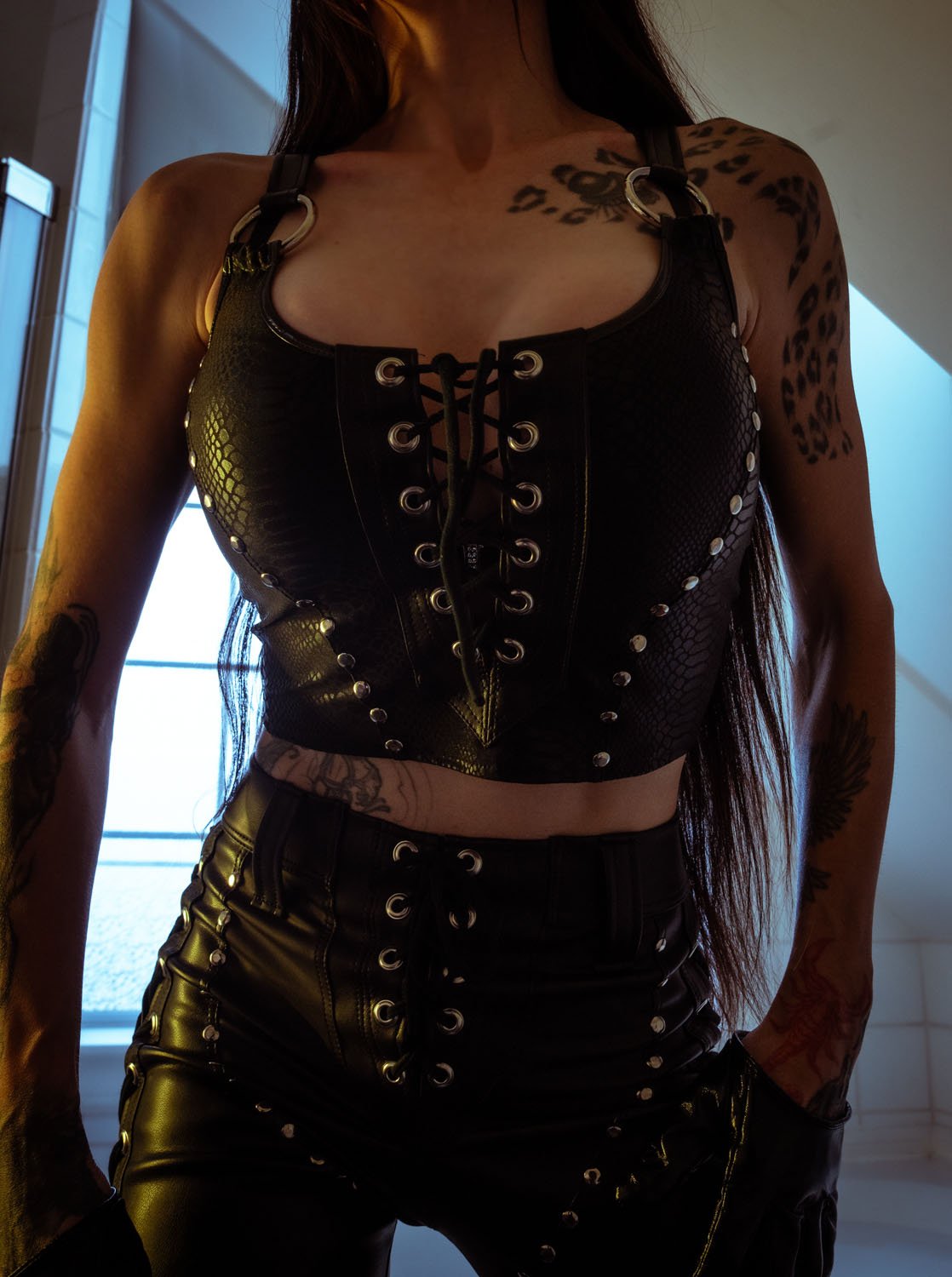 Made from scratch out of black on black snakeskin stretch with faux leather lace ups and straps and metal detailing all around.