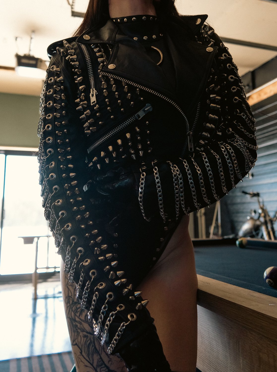 Made from scratch out of black genuine leather with tons of studs and chain all around. Fully lined.