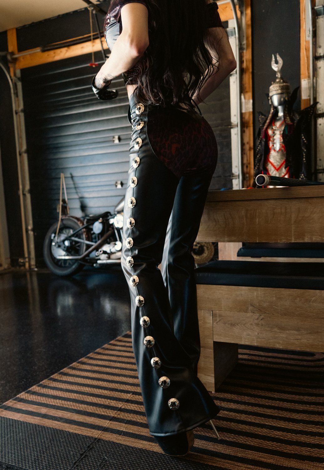 Made from scratch out of buttery soft black faux leather stretch and leopard stretch velvet with conchos down the leg and metal detailing all around.