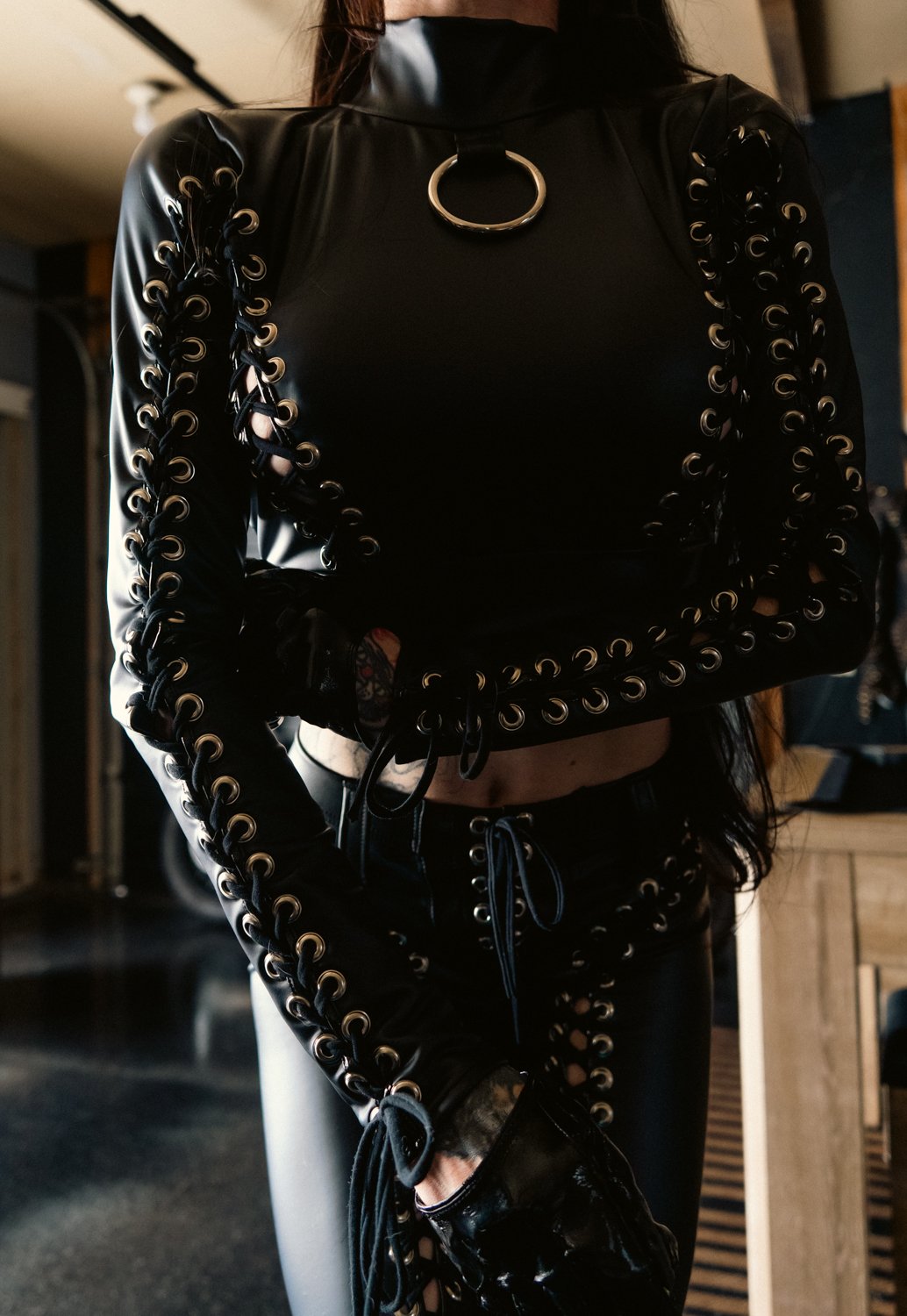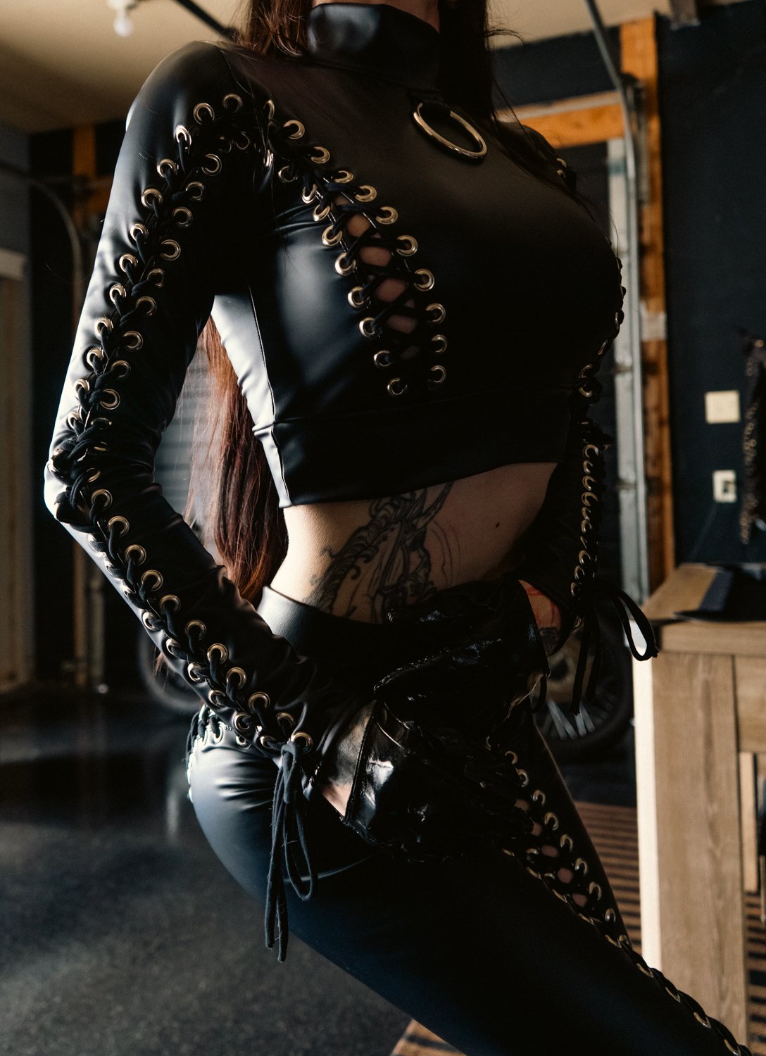 Made from scratch out of black leather look spandex with lace ups and metal detailing all around.