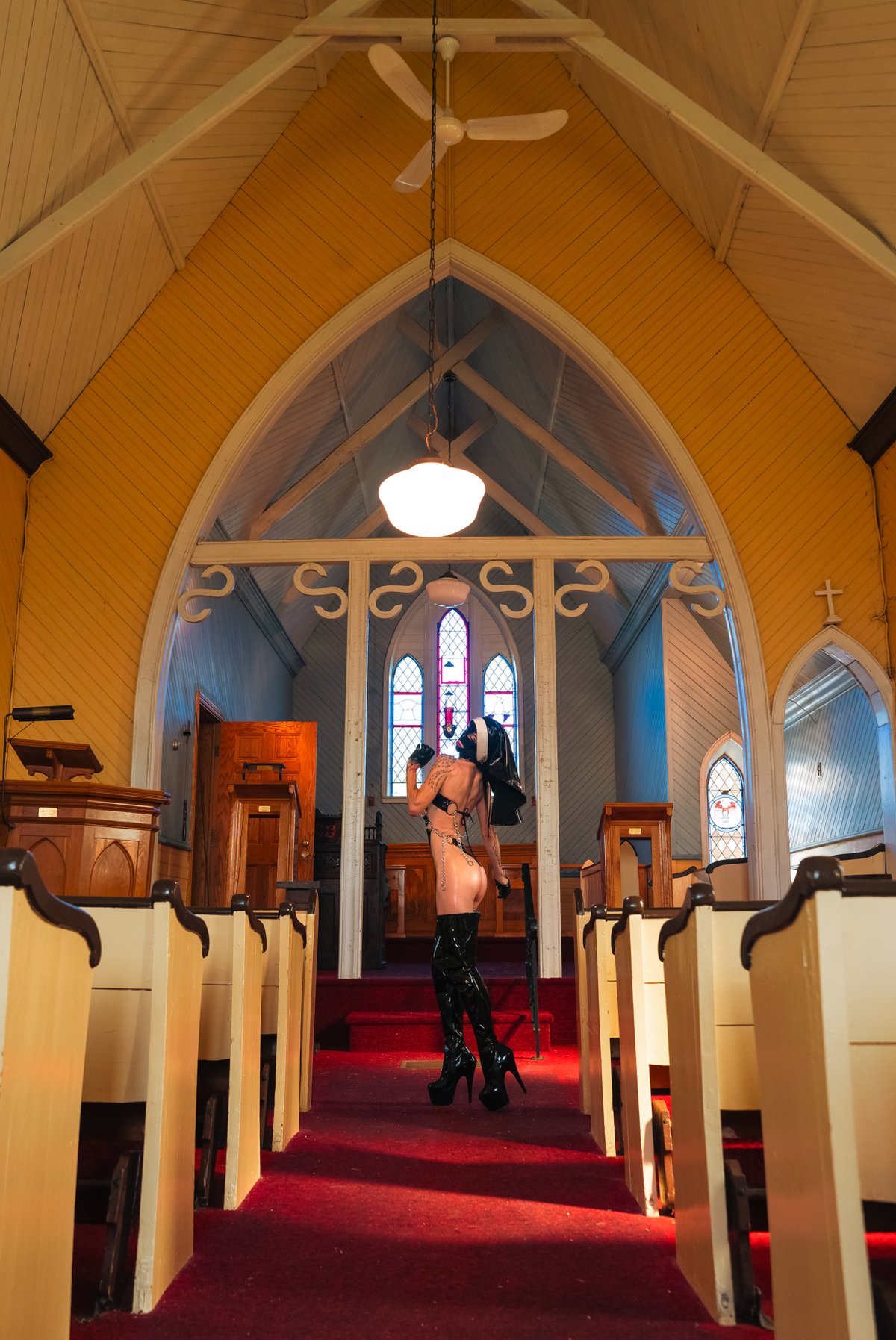Made from scratch out of black and white faux patent leather, silver crucifixes, and chain and metal detailing all around. Neck strap, back, and hips are adjustable!