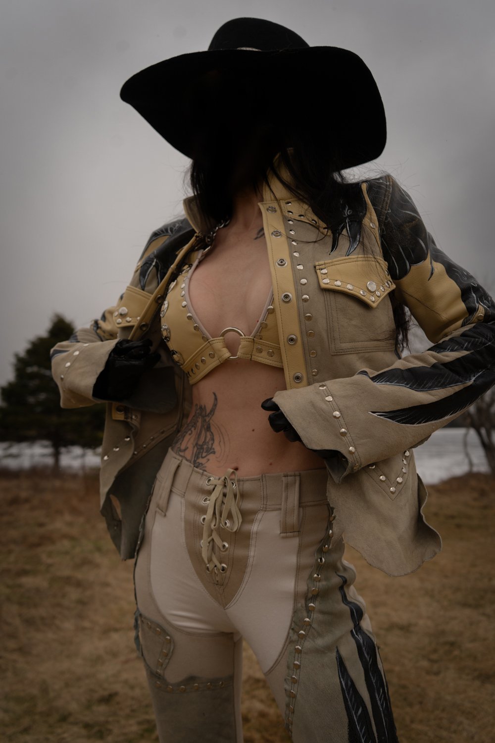 Made from scratch out of cream deerskin genuine leather with conchos, chain, and metal detailing all around.
